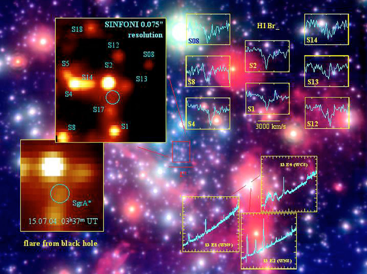 - images and first-ever detailed spectra of many of the stars that move near the massive black hole at the Galactic Centre, with crucial information on the nature of the individual stars and their motions (Appendix C);