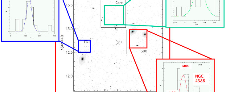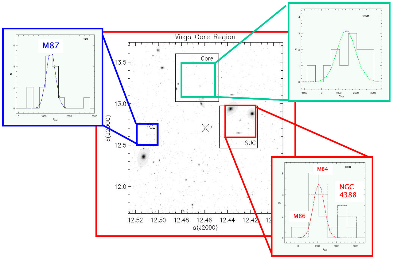 The international team of astronomers [2] went on further to make a detailed study of the motions of the planetary nebulae in the Virgo cluster in order to determine its dynamical structure and compare it with numerical simulations. To this aim, they carried out a challenging research programme, aimed at confirming intracluster planetary nebula candidates they found earlier and measuring their radial velocities in three different regions ("survey fields") in the Virgo cluster core.