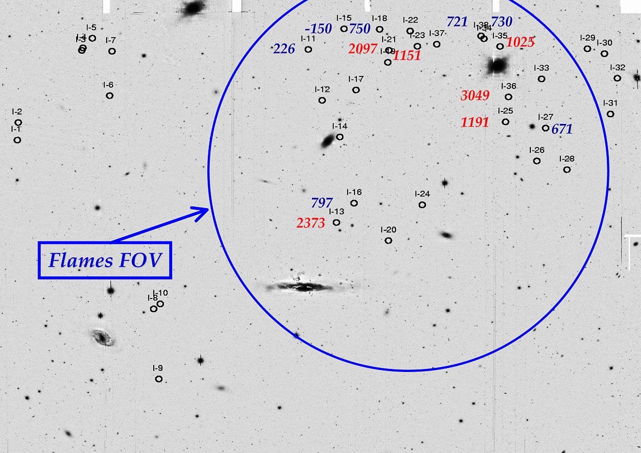 This is far from an easy task. The emission in the main Oxygen emission line from a planetary nebula in Virgo is comparable to that of a 60-Watt light bulb at a distance of about 6.6 million kilometres, about 17 times the average distance to the Moon. Furthermore intracluster planetary nebula samples are sparse, with only a few tens of planetary nebulae in a quarter of a degree square sky field - about the size of the Moon. Spectroscopic observations thus require 8 metre class telescopes and spectrographs with a large field of view. The astronomers had therefore to rely on the FLAMES-GIRAFFE spectrograph on the VLT [4], with its relatively high spectral resolution, its field of view of 25 arcmin and the possibility to take up to 130 spectra at a time.