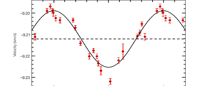 The planet was revealed by the wobble it induces on the host star. With the HARPS very precise measurements, the astronomers found the star to move back and forth with a maximum velocity of 13 metres/second, or a little bit less than 50 km/h.