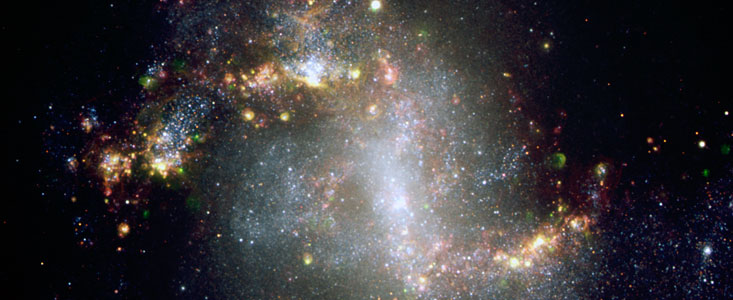 But NGC 1313 is not just a pretty picture. A mere scratch beneath the elegant surface reveals evidence of some of the most puzzling problems facing astronomers in the science of stars and galaxies. Starburst galaxies are fascinating objects to study in their own right; in neighbouring galaxies, around one quarter of all massive stars are born in these powerful engines, at rates up to a thousand times higher than in our own Milky Way Galaxy.