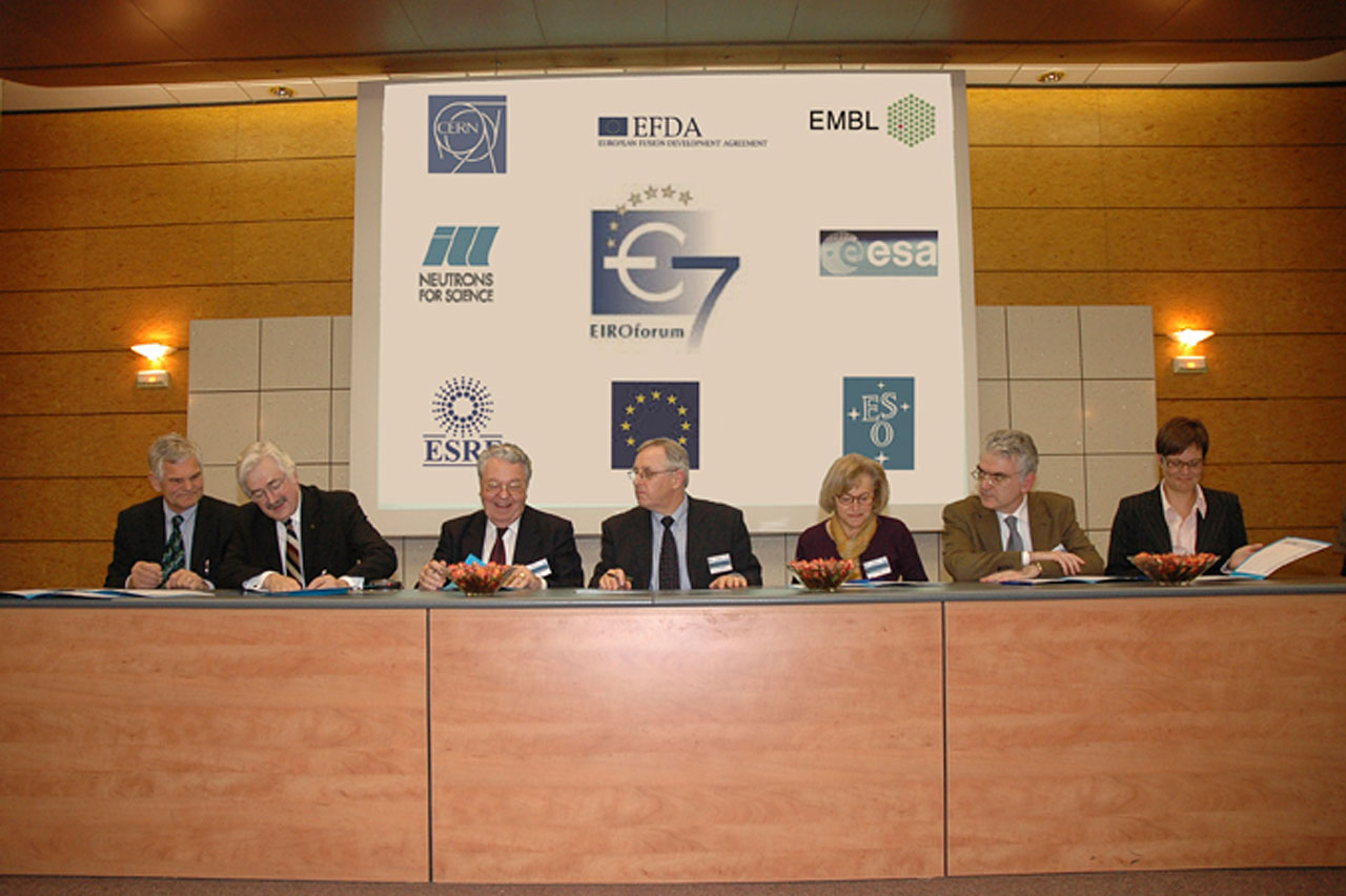 The signature of the statement of support last November. From left to right: Richard Wagner, Director of the ILL, David Southwood, Scientific Director of ESA, Robert Aymar, Director General of CERN, Bill Stirling, Director General of ESRF, Catherine Cesarsky, Director General of ESO, Francesco Romanelli, EFDA-JET leader and Silke Schumacher, Coordinator International Relations and Communication of the EMBL.