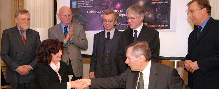"We warmly welcome the Czech Republic as the thirteenth member of ESO," said Catherine Cesarsky, ESO's Director General. "The timing couldn't be better chosen: with the Very Large Telescope, Europe is now at the forefront of ground-based astronomy, and with the construction of ALMA and the final studies for the European Extremely Large Telescope, we will ensure that this will remain so for several decades. We look forward to working together with our Czech colleagues towards these successes."