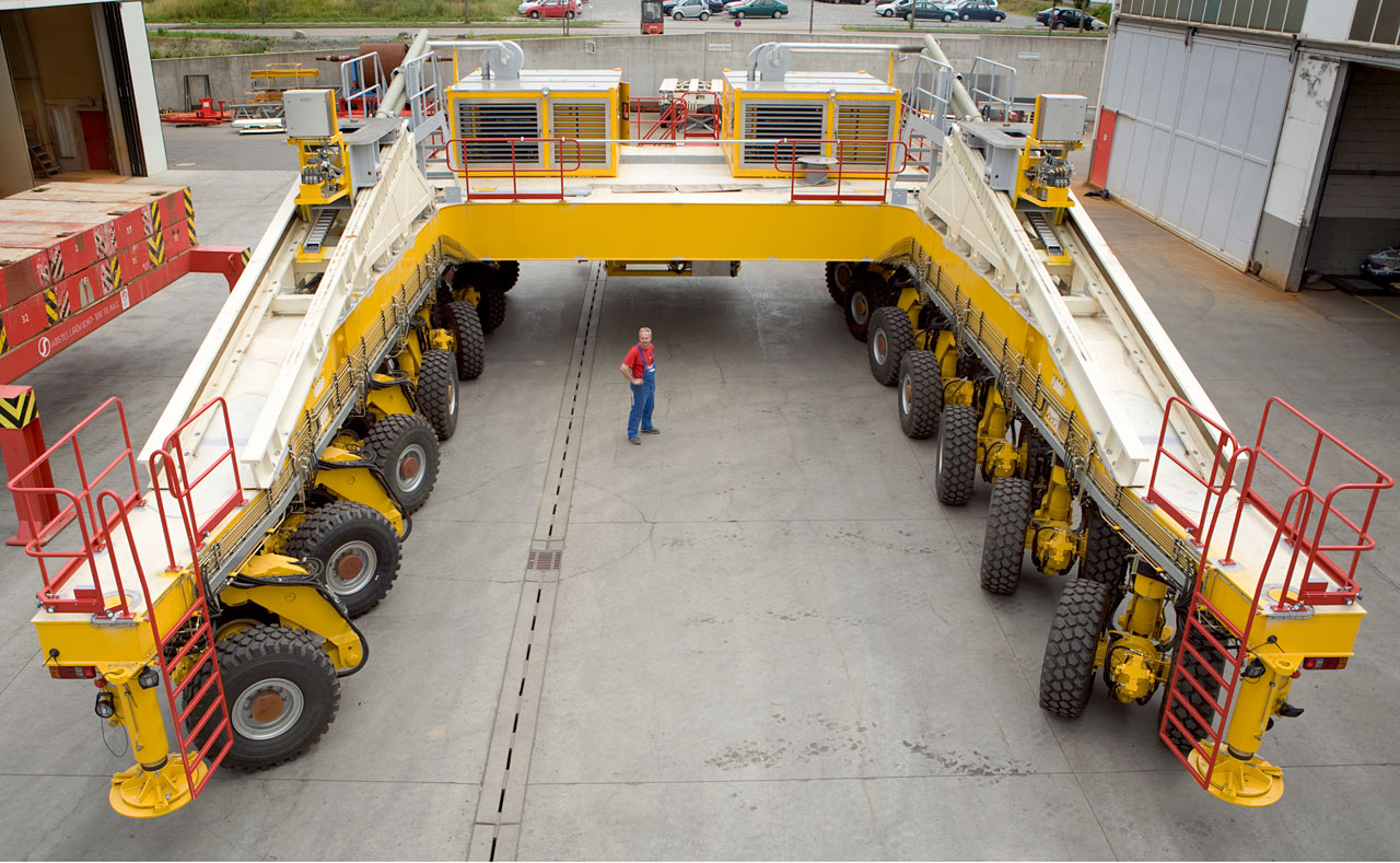 Given their important functions, both for the scientific work and in transporting high-tech antennas with the required care, the vehicles must live up to very demanding operational requirements. Each transporter has a mass of 130 tons and is able to lift and transport antennas of up to a weight of 115 tons. The transporters have to position the antennas on the docking pads with precision in the millimetre range. On the other hand, the transporters must be powerful enough to reliably and safely climb from an altitude of 2900 m to 5000 m with their heavy and valuable load, putting extraordinary demands on the two 500 kW diesel engines.