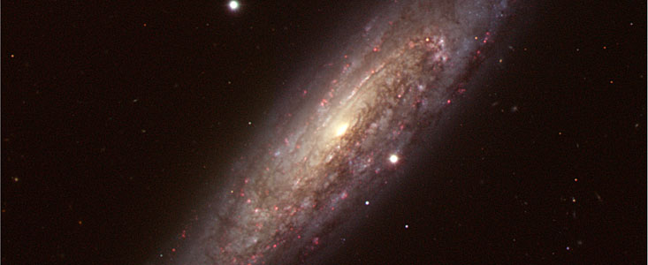 The superb VLT image also shows that the galaxy has its fair share of ionised hydrogen regions (HII regions) lounging along its spiral arms. Seen in the image as red features, these are glowing clouds of hot gas in which stars are forming. The galaxy also shows prominent dark lanes of dust across the disc, obscuring part of the galaxy's starlight.