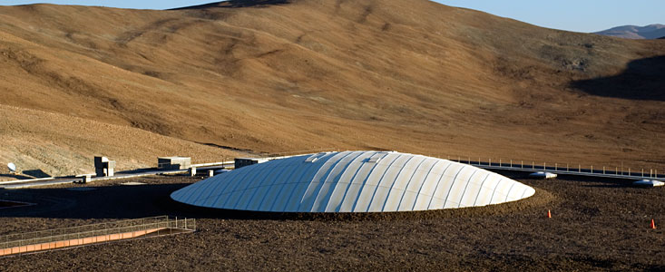To make it possible for people to live and work here, a hotel or "Residencia" was built in the base camp, allowing them to escape from the arid outside environment. Here, returning from long shifts at the VLT and other installations on the mountain, they can breathe moist air and relax, sheltered from the harsh conditions outside. The Residencia's award-winning design, including an enclosed tropical garden and pool under a futuristic domed roof, gives its interior a feeling of open space within the protective walls - this is a true "haven in the desert".