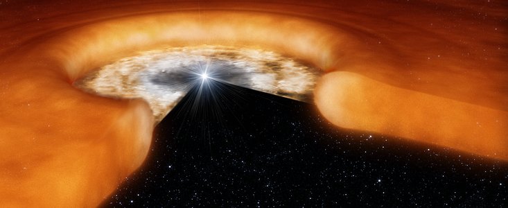 Infant stars form from a disc of gas and dust that surrounds the new star and, later, may also provide the material for a planetary system. Because the closest star-forming regions to us are about 500 light-years away, these discs appear very small on the sky, and their study requires special techniques to be able to probe the finer details.