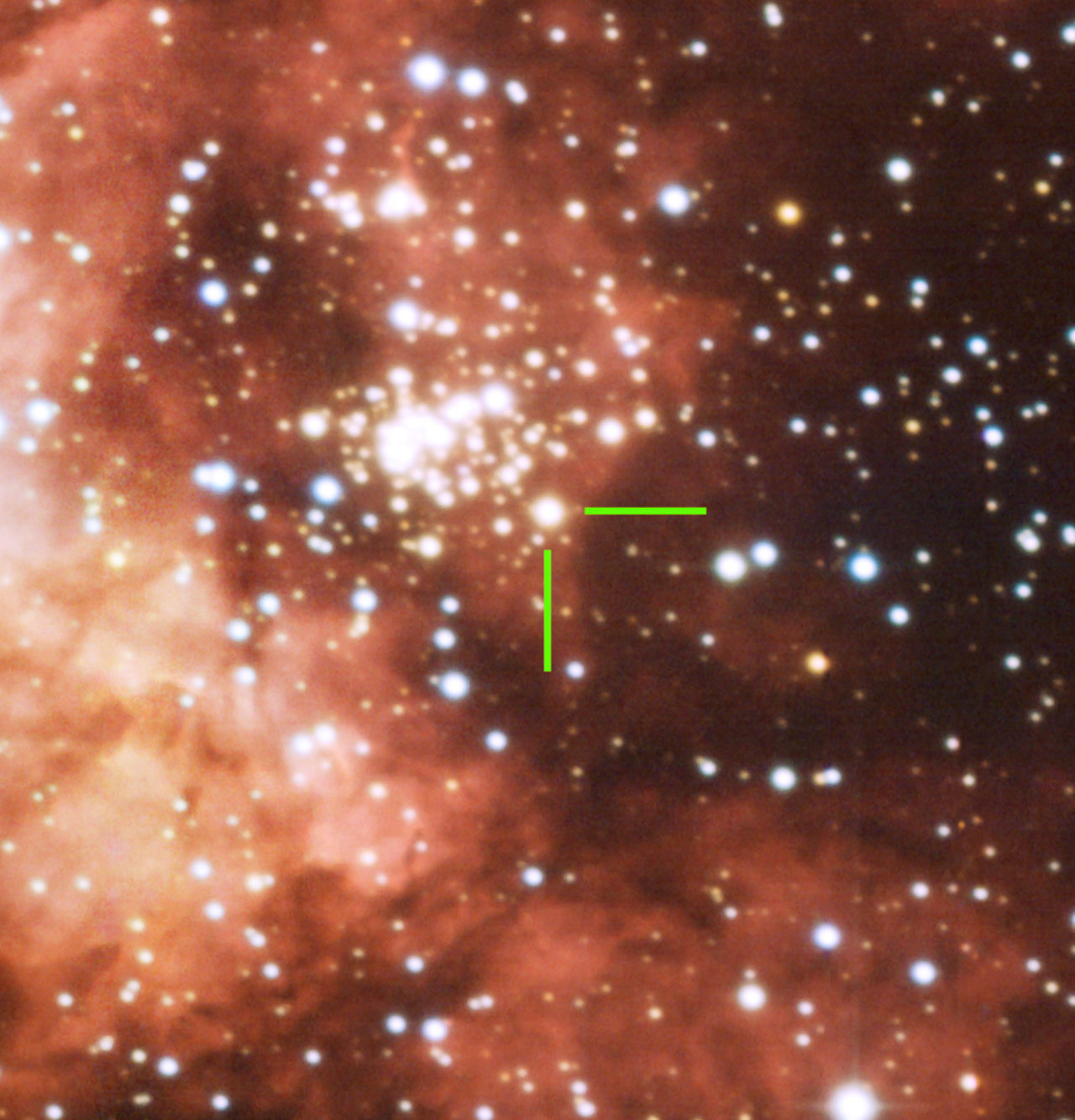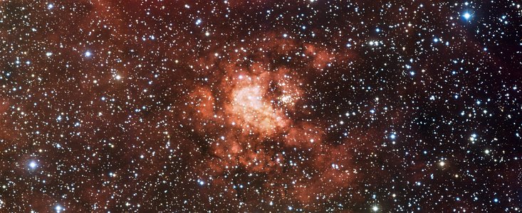 Embedded deep within the huge, nebulous expanse of Gum 29, the relatively little known cluster of Westerlund 2 is clearly seen in the centre of this image. The latest measurements indicate that it lies at a distance of some 26 000 light-years from Earth, placing it towards the outside edge of the Carina spiral arm of the Milky Way. The cluster's distance has been the subject of intense scrutiny in the past, as it is one of the parameters needed to understand this intriguing object. Westerlund 2 is very young too, with an age of only 1—2 million years.