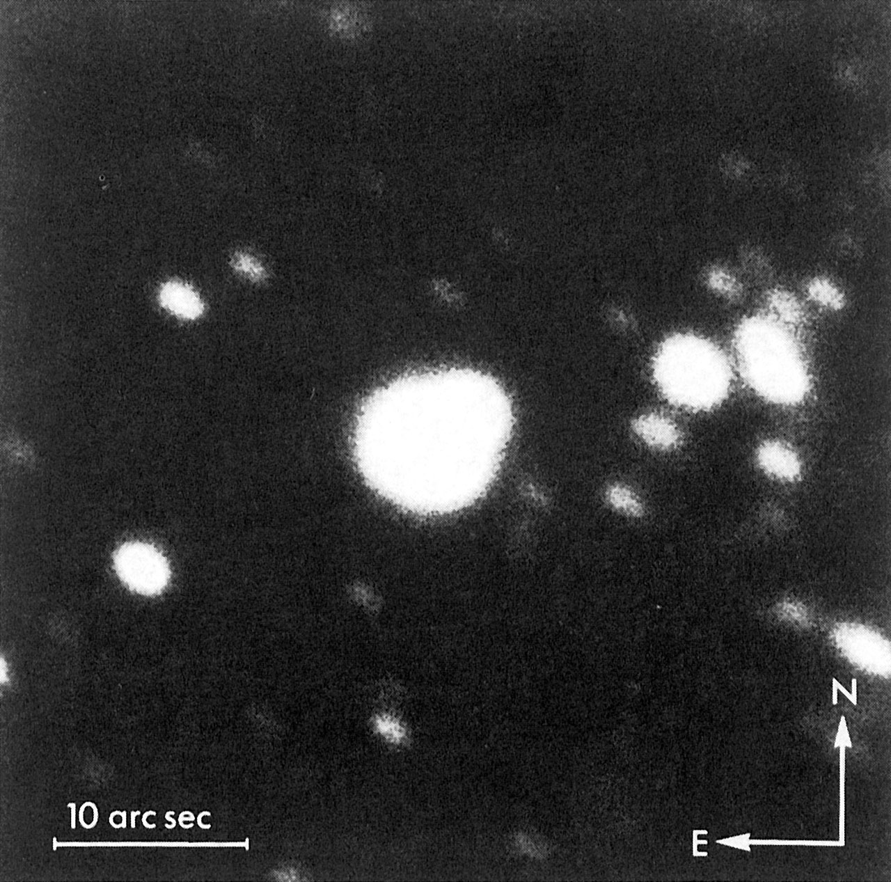 B/W photo from 25 February 1987 of the same area and with the same scale, now showing the very bright supernova, and