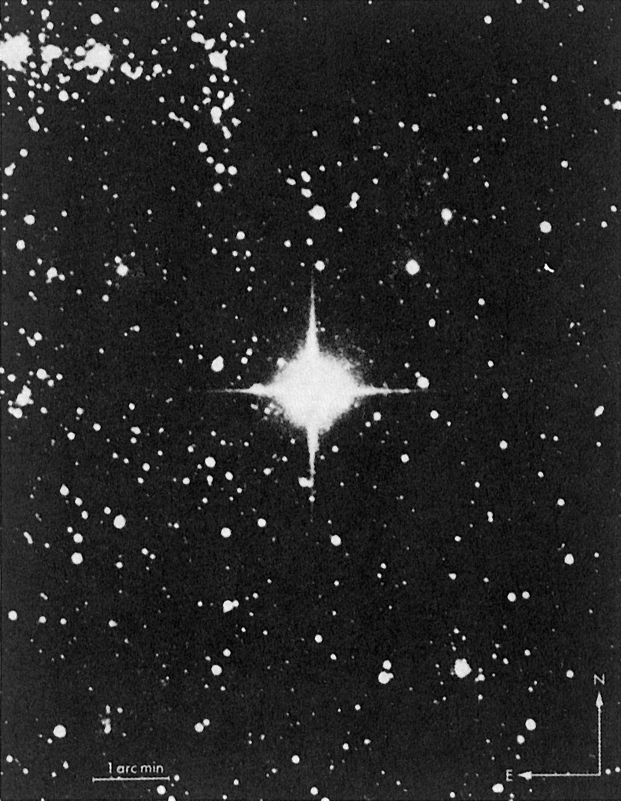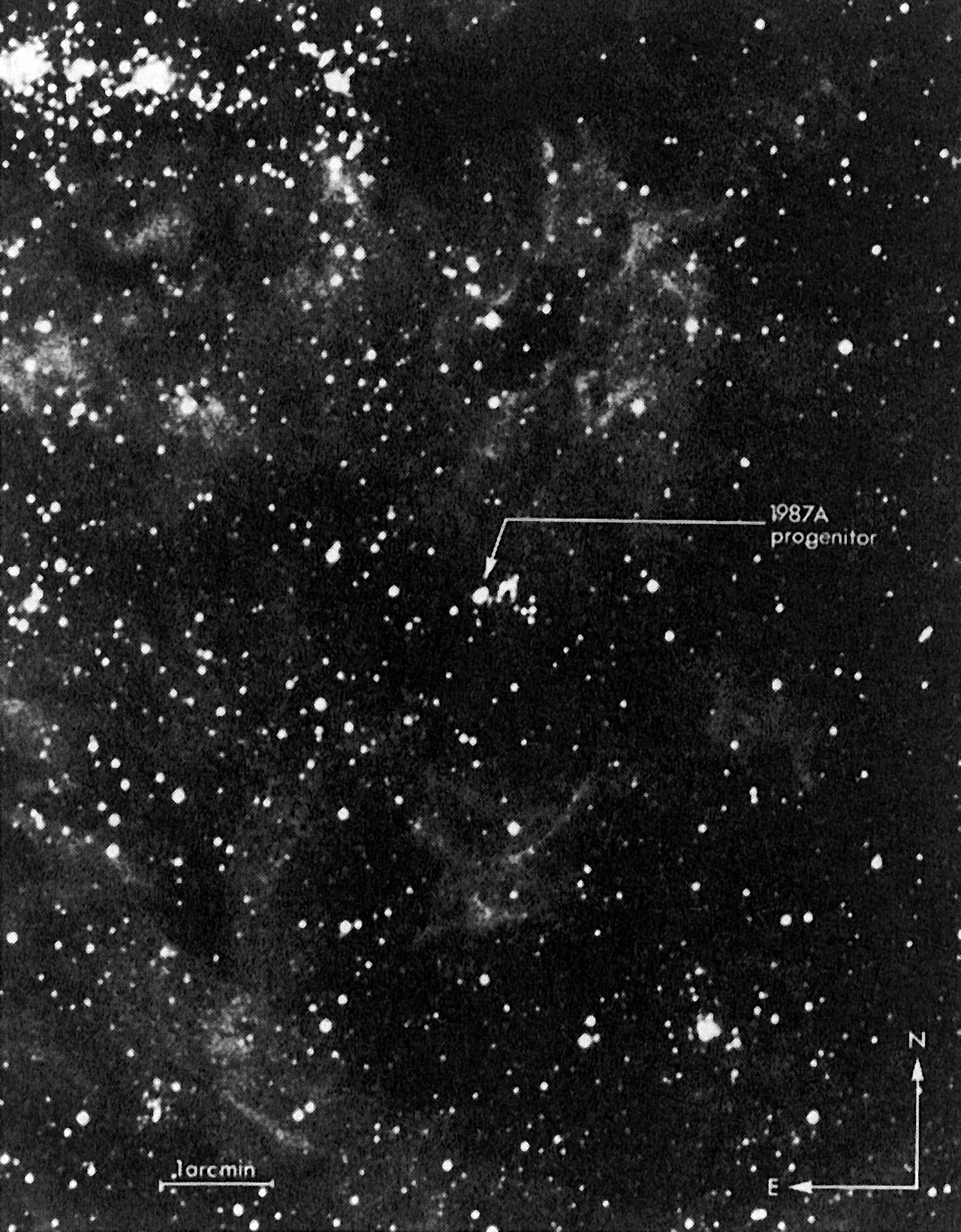 B/W photo from 1977 showing the sky area of the supernova event, with the progenitor indicated,