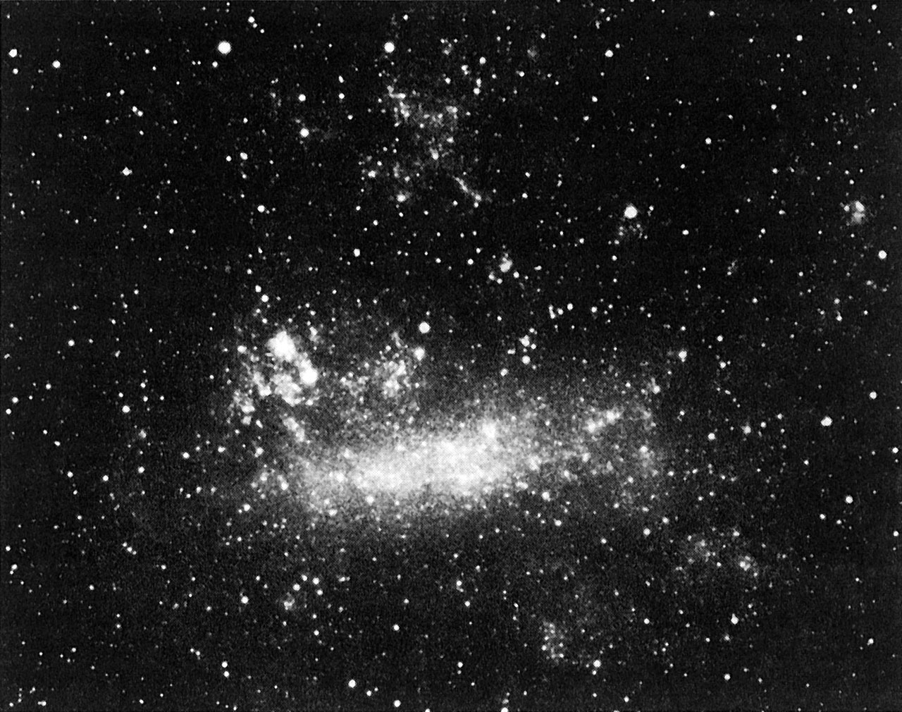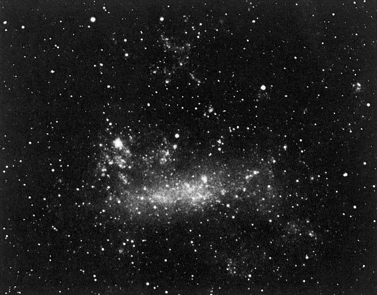 Colour picture of the LMC, obtained on 25 February 1987, and clearly showing the entire LMC galaxy and the supernova near the Tarantula Nebula.