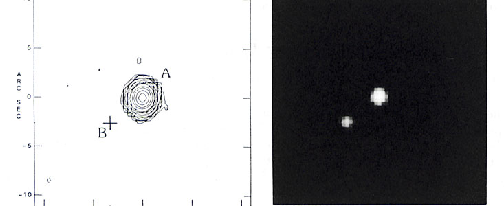At first, the astronomers thought that the twin images might be another example of the so-called gravitational lens phenomenon: an image of a single distant quasar split in two by the gravitational field of a Galaxy or cluster of galaxies lying between the observer and the quasar. First predicted by Einstein's general theory of relativity some fifty years ago, several such gravitational lenses are currently known, the first one of which was, coincidentally, also confirmed by the Multiple Mirror Telescope in 1979.