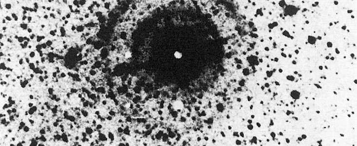 For these exposures of SN 1987A with the EFOSC instrument at the ESO 3.6 m telescope, the bright light from the supernova itself was dimmed by the insertion of a small, obscuring disk into the instrument. Two almost concentric rings are clearly visible with radii of 32 and 51 arcseconds. The rings are brighter towards North (top of photo), probably because there is more interstellar matter in this direction. The intensity of the light echo is more than 10,000 times fainter than the current brightness of the supernova and is in agreement with the predicted intensity.