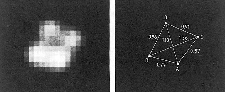 The images were obtained under very good atmospheric conditions with the ESO/MPI 2.2m telescope and a high-resolution CCD camera and show clearly the quasar H 1413+117 as a quadruple object. All four images are about equally bright and they are separated by less than 1 arcsecond; see the accompanying photo.