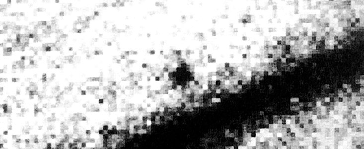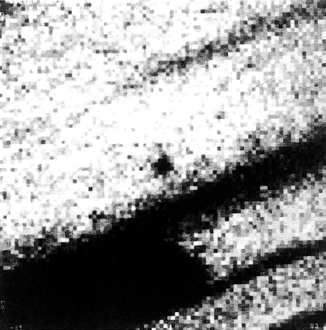 To see the faint light from the distant object, exposures totalling 980 min (16 hrs 20 min) were obtained. The ``negative'' picture shown here is a composite of 23 frames, each individually cleaned. The image of Halley at the centre is pointlike; the straight lines are trails of stars and galaxies in the field, because the telescope was set to follow the comet's motion. The mean, visual brightness of Halley during the observing period was 24.4 magnitude and brightness variations of 1.3 magnitude were seen.