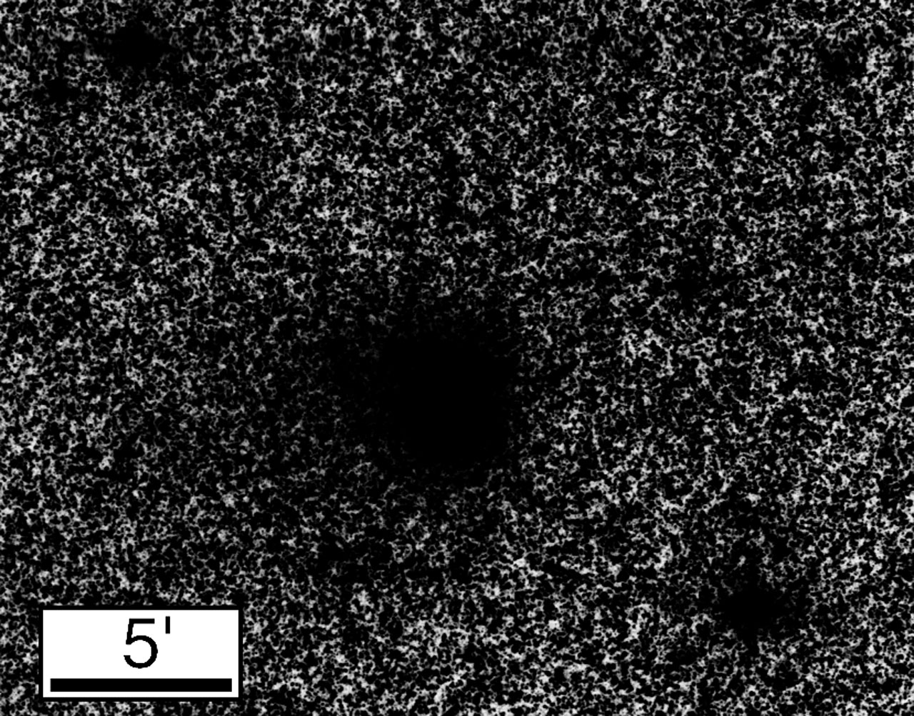In order to better show the real extent of the surrounding coma, ESO Press Photo eso9521b displays a photographically enhanced copy of the original plate. In this process, the contrast has been greatly increased so that even very faint areas of the diffuse coma become visible. The comet now appears as a roughly circular, dark object in the front of myriads of stars in this sky area. Its angular size is at least 5 arcminutes, much larger than on the direct reproduction (eso9521a). There also seems to be a very faint extension towards East (left).