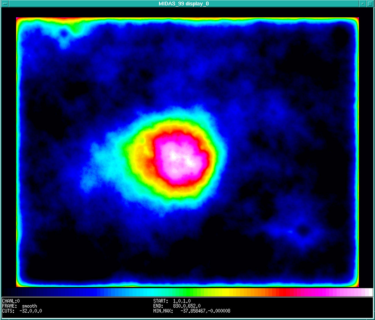This false-colour photo was produced in this way by means of computer processing within the MIDAS image processing system. The images of the brightest stars could not be completely removed by this process and faint remnants are still present. (In technical terms, a 2-D low-pass Fourier filter was used to achieve heavy smoothing over approx. 16 x 16 arcsec cells).