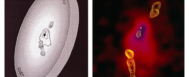 When the optical and radio images are combined, it is seen that a radio 'jet' emerges from the centre of the galaxy and interacts vigorously with the inner region of the gas cloud. This jet is believed to be a narrow stream of high-energy electrons spewed out at the edge of a black hole located at the center of the galaxy. Such jets are often seen in distant radio galaxies.