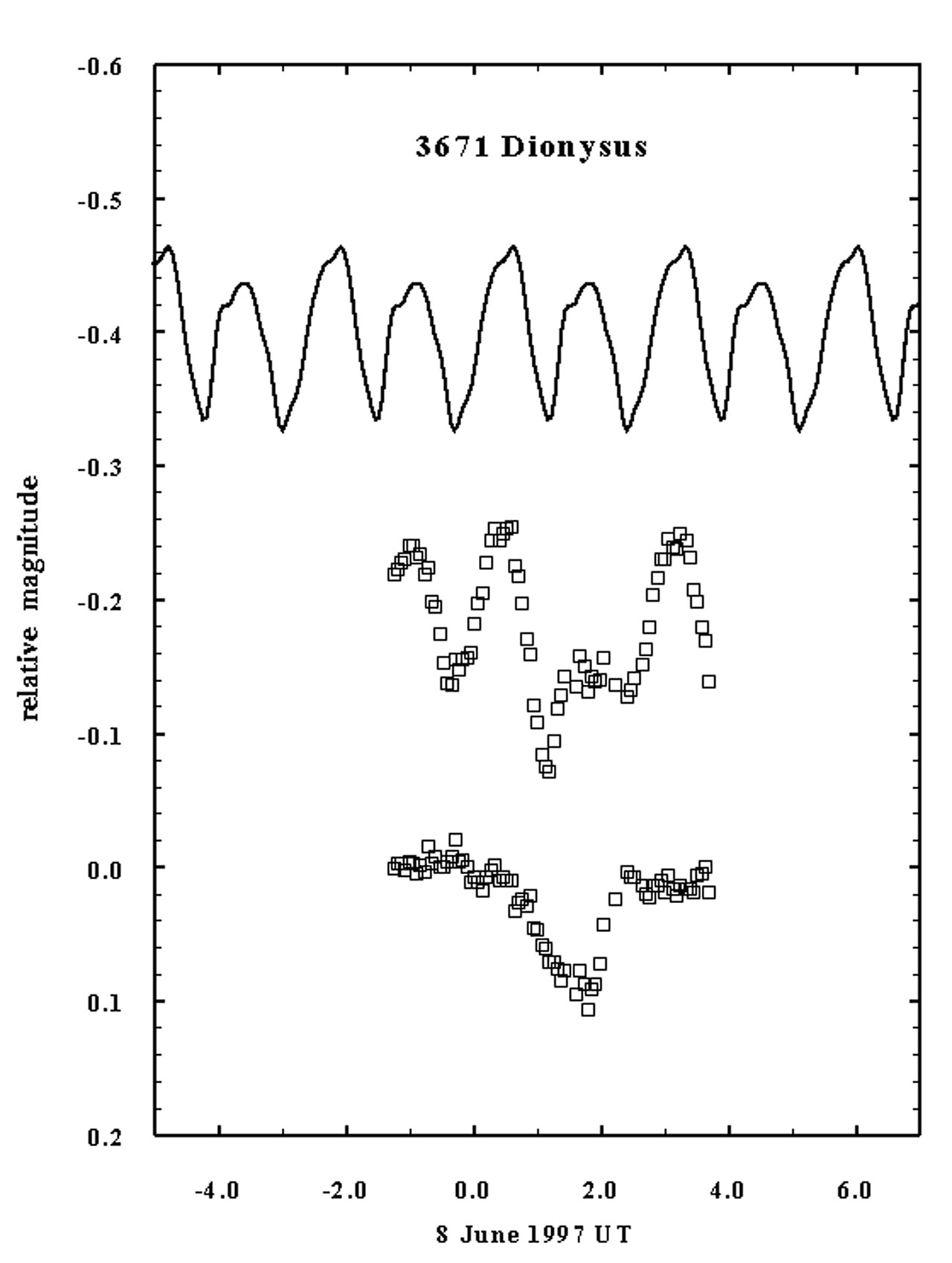 [5] The method of analyzing the lightcurve of Dionysus consists of `removing' (subtracting) the normal short-period brightness variations due to rotation of the asteroid and plotting the residuals against time. The residual lightcurve shows a clear resemblance with typical lightcurves of eclipsing binary stellar systems (in which two stars move around each other, producing mutual eclipses) and leads to a model of two bodies revolving around a common gravitational centre, in an orbital plane containing both the Earth and the Sun.