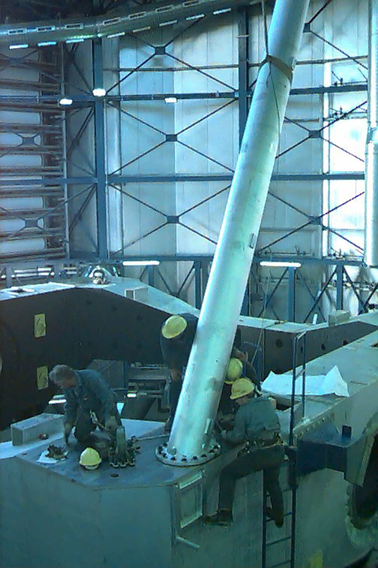 In order to better visualize the location of the big centerpiece and the Serrurier struts within the overall telescope structure, it may be useful to inspect eso9721a. It was obtained during the pre-assembly phase in December 1995, at the time when the ESO Council visited the Ansaldo factory in Milan (Italy).