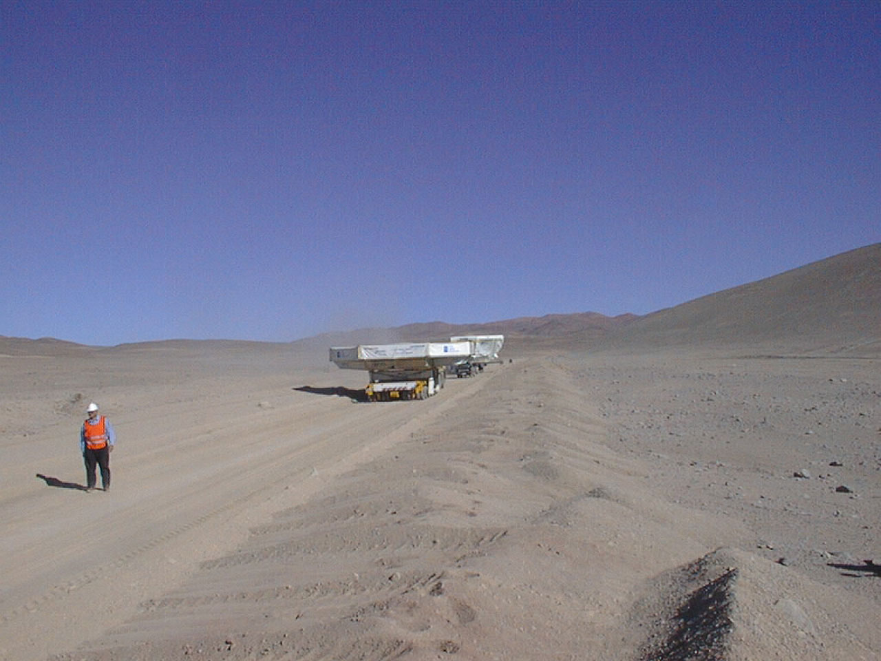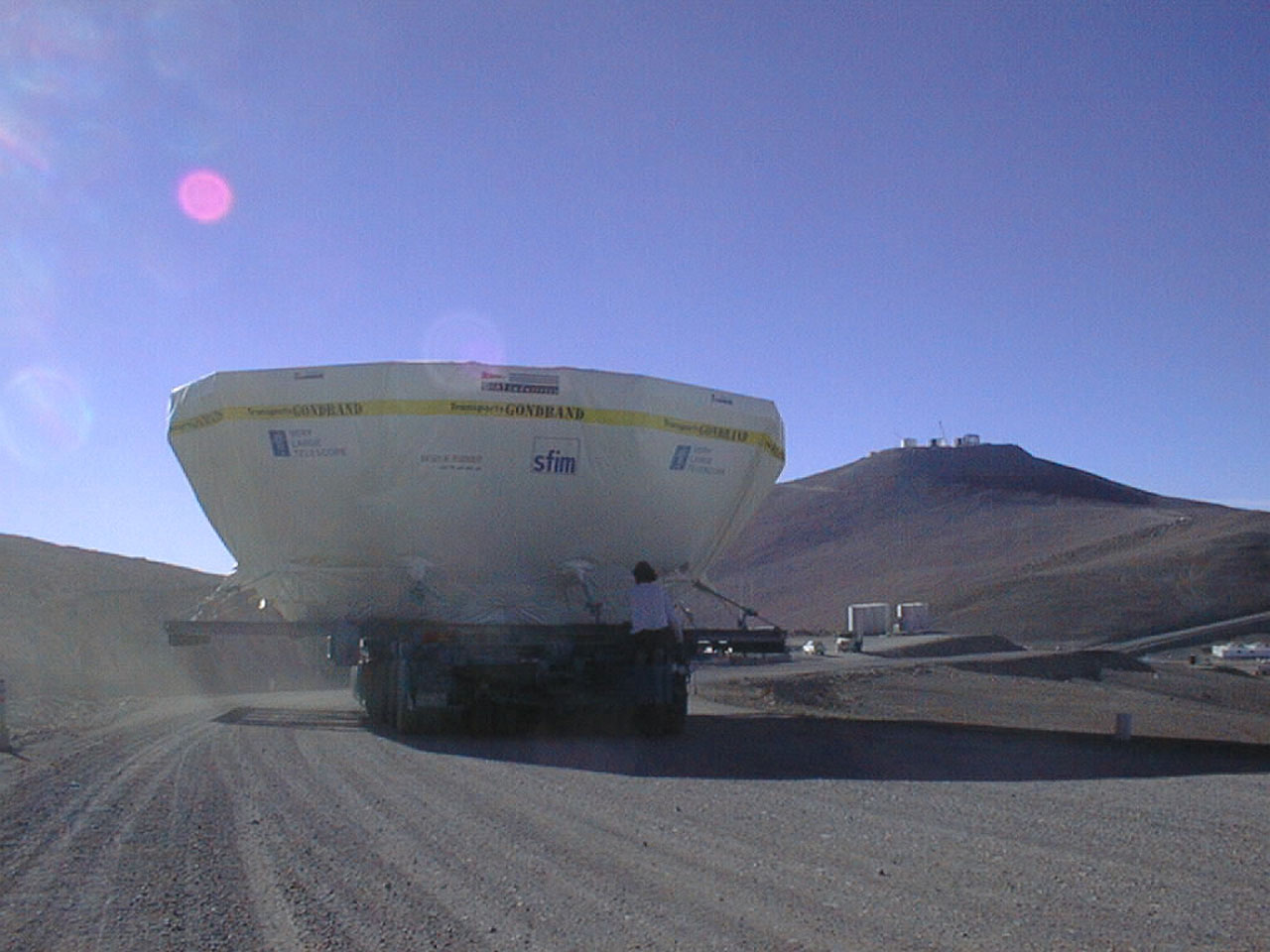 The M1 cell - on which the first 8.2 m mirror will later be placed - measures 9 x 10 metres and stands 3.5 m tall; it weighs about 20 tonnes. Thus the special, oversize transport from Antofagasta to Paranal had to move slowly and carefully. The concrete dummy mirror with a diameter of 8.2 metres weighs the same as the real Zerodur mirrors (23 tonnes) and was stored in a special box. It took 3 days for the convoy to cover the 130 kilometres along the desert road.