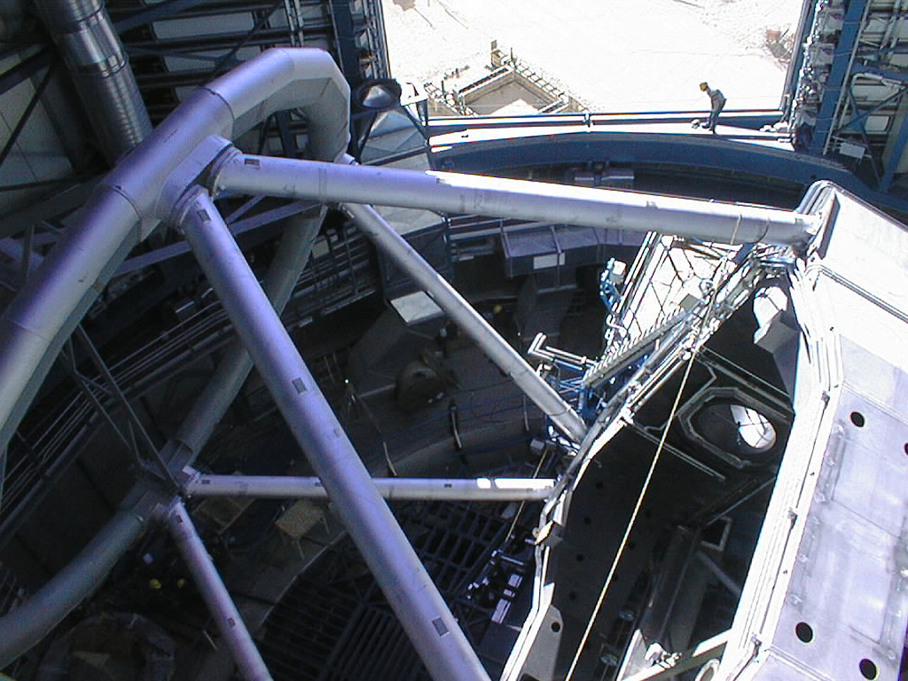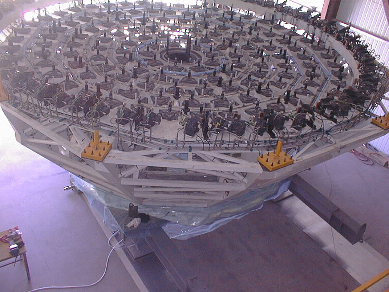 At a later stage, the M1 cell and the concrete mirror will be brought up the mountain road to the first of the four 8.2-m telescopes (Unit Telescope no. 1, or UT1) and attached at the bottom of the `telescope tube'. Again, this will serve to adjust the mechanical parts and to balance the telescope without risk to the real mirror. Before First Light will be achieved next year, the cell will be taken down to the MMB for exchange of the dummy mirror with the real one and then brought back up again to the telescope.