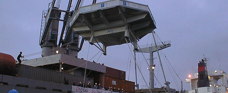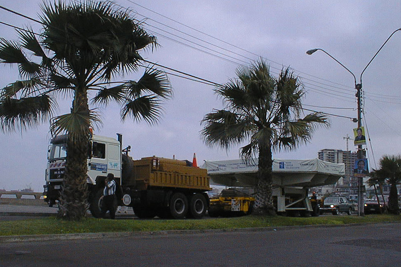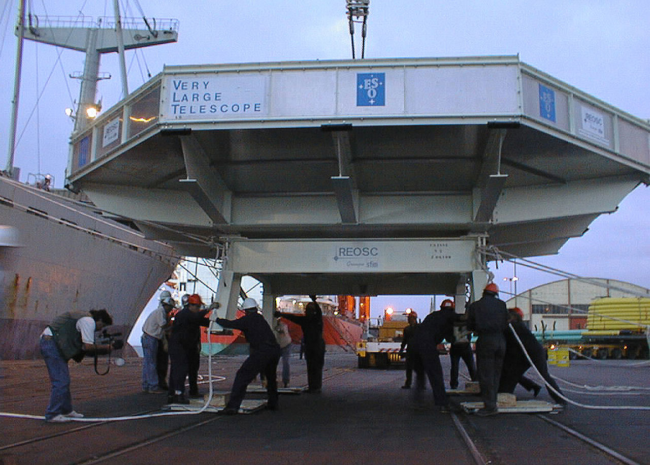 Following an uneventful transatlantic journey onboard M/S Tarpon Santiago, it arrived safely in the port of Antofagasta in the evening of Saturday, December 6, 1997. The 8.2-m mirror in its special Tranport Container was unloaded from the ship and made a gentle touch-down on Chilean soil at about 21:30h. A heavy-load trailer was positioned underneath and everything was prepared for the road transport to the Paranal Observatory.