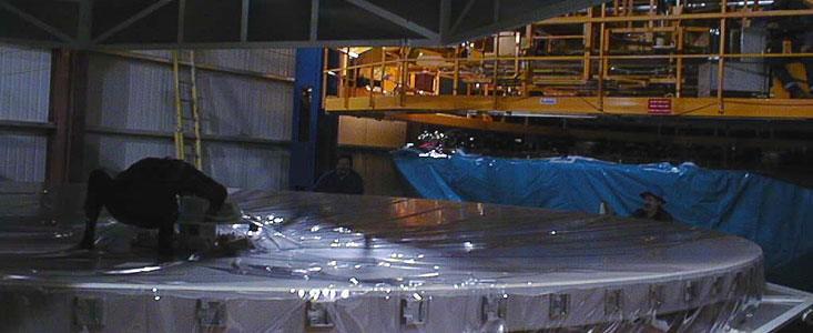 Please refer also to the twelve high-quality photographic images of this event In addition, the first (digital) photo from the inspection of the mirror after arrival is now available. It shows the mirror in its box on December 18, 1997, now within the Mirror Maintenance Building (MMB), and moments after the cover had been removed. During the ensuing careful inspection of the complete mirror surface, no damage was detected.