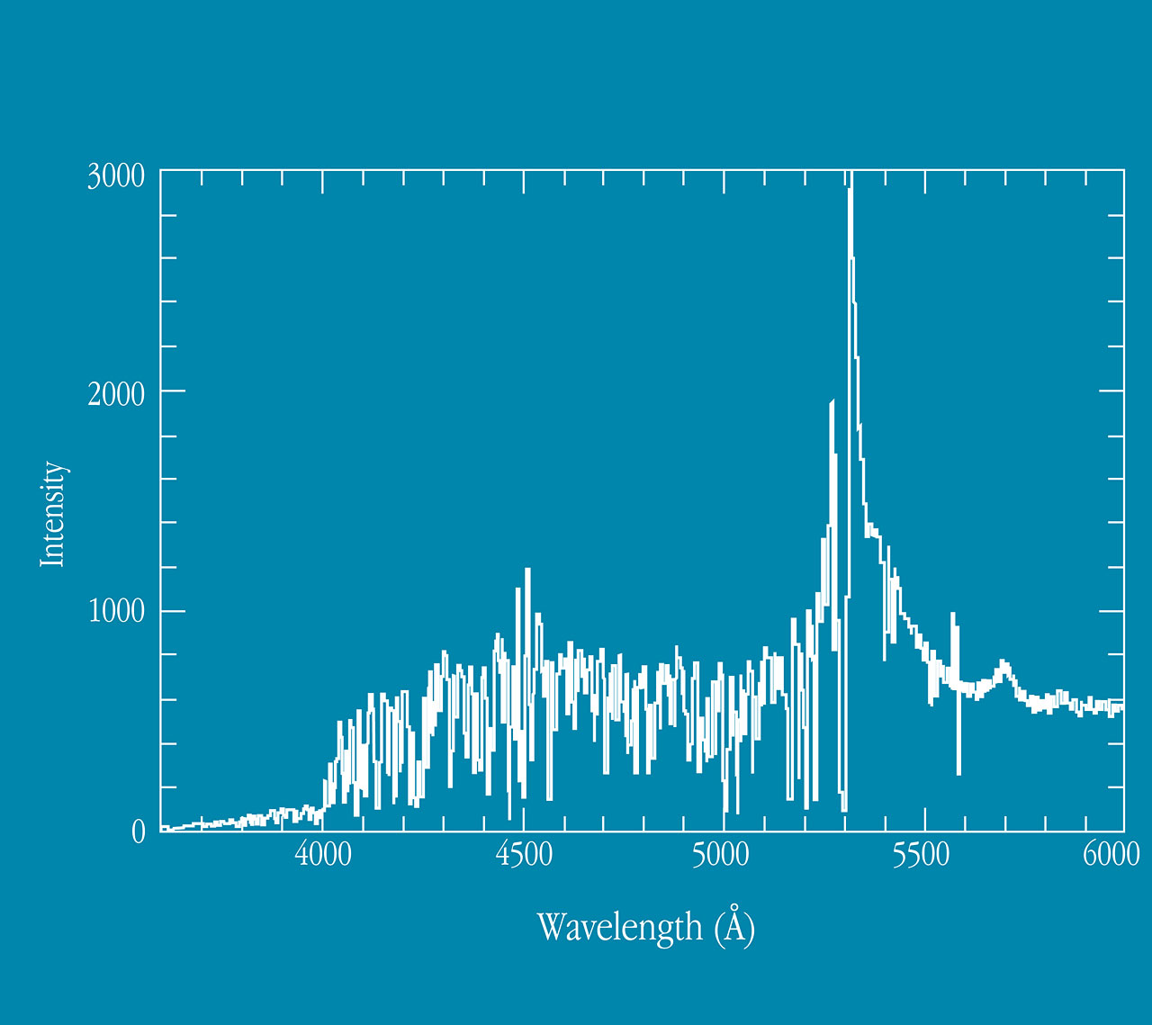 eso9857e displays a spectrum of the distant quasar Q0103-260 (visual magnitude V = 18.8 , redshift z = 3.36 ) with a prominent emission line at 5300 Å (530 nm), identified as the Lyman-alpha resonance line of atomic hydrogen, redshifted from 1216 Å to 5300 Å.