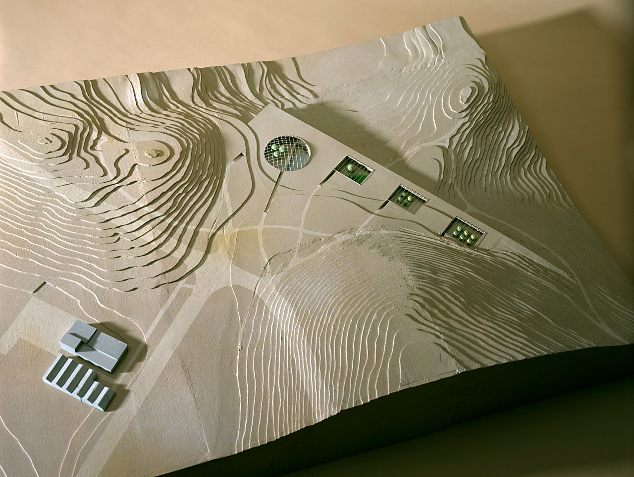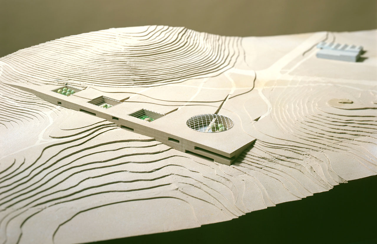 The building is fully integrated into the landscape, essentially underground with its southern and western facades emerging from the ground, providing a view from the bedrooms, offices and restaurant towards the Pacific Ocean.
