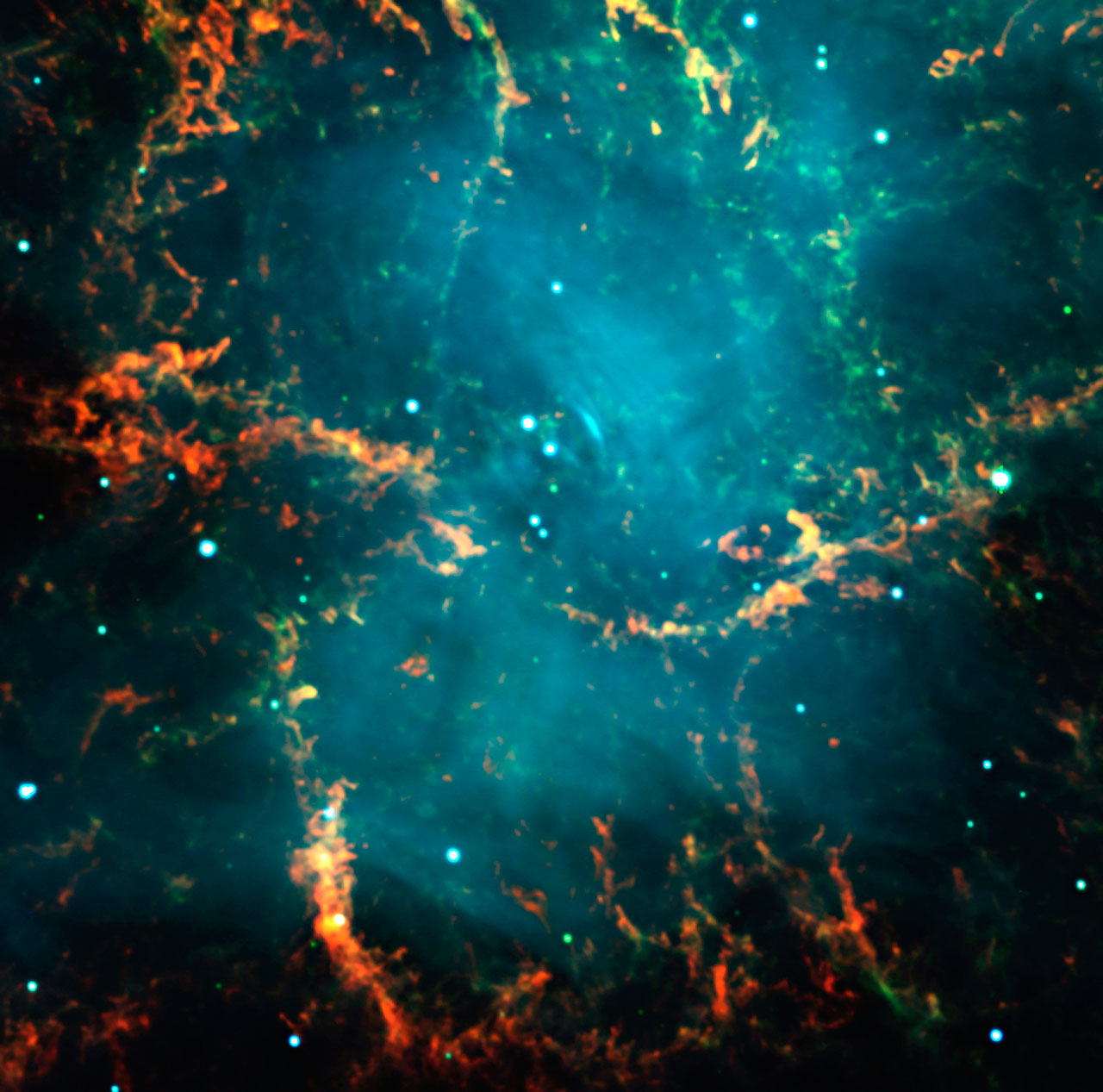 In this picture, the green light is predominantly produced by hydrogen emission from material ejected by the star that exploded. The blue light is predominantly emitted by very high-energy ("relativistic") electrons that spiral in a large-scale magnetic field (so-called syncrotron emission ). It is believed that these electrons are continuously accelerated and ejected by the rapidly spinning neutron star at the centre of the nebula and which is the remnant core of the exploded star. This pulsar has been identified with the lower/right of the two close stars near the geometric center of the nebula, immediately left of the small arc-like feature, best seen in eso9948g.