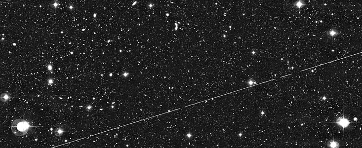 The bright and straight line that extends from the bottom to the right edge in ESO Press Photo eso9954a is the trail of an earth-orbiting artificial satellite that passed through the telescope's field-of-view during one of the exposures. There is also another, fainter trail from another satellite in the upper left quadrant, best visible in the High-Res version of this photo.
