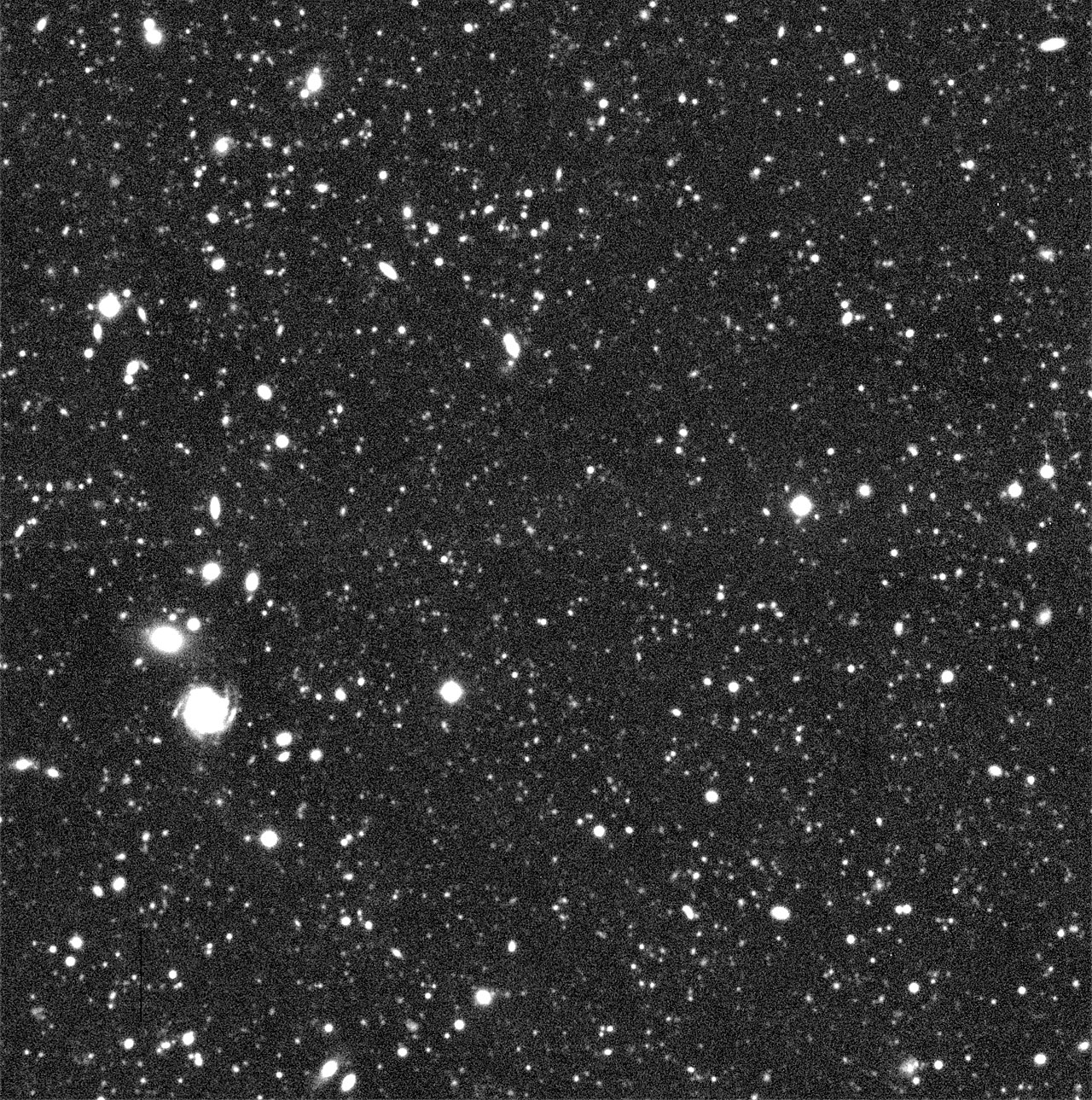Advanced image processing software was used to find, classify and count the objects in this field. As expected, most of the brighter, small sources turned out to be foreground stars in the Milky Way. However, because the stars in the Milky Way Galaxy are essentially confined to a relatively thin disk and this line of sight is at a large angle to this disk, the number of stars visible down to a certain brightness limit only increases slowly in this direction. The counts show that at magnitude 20 [1], there are already more galaxies than stars, and at magnitude 24.5 the galaxies outnumber the stars by a factor of 5. The detection limit for galaxies in this photo is at about magnitude 26.0-26.5.