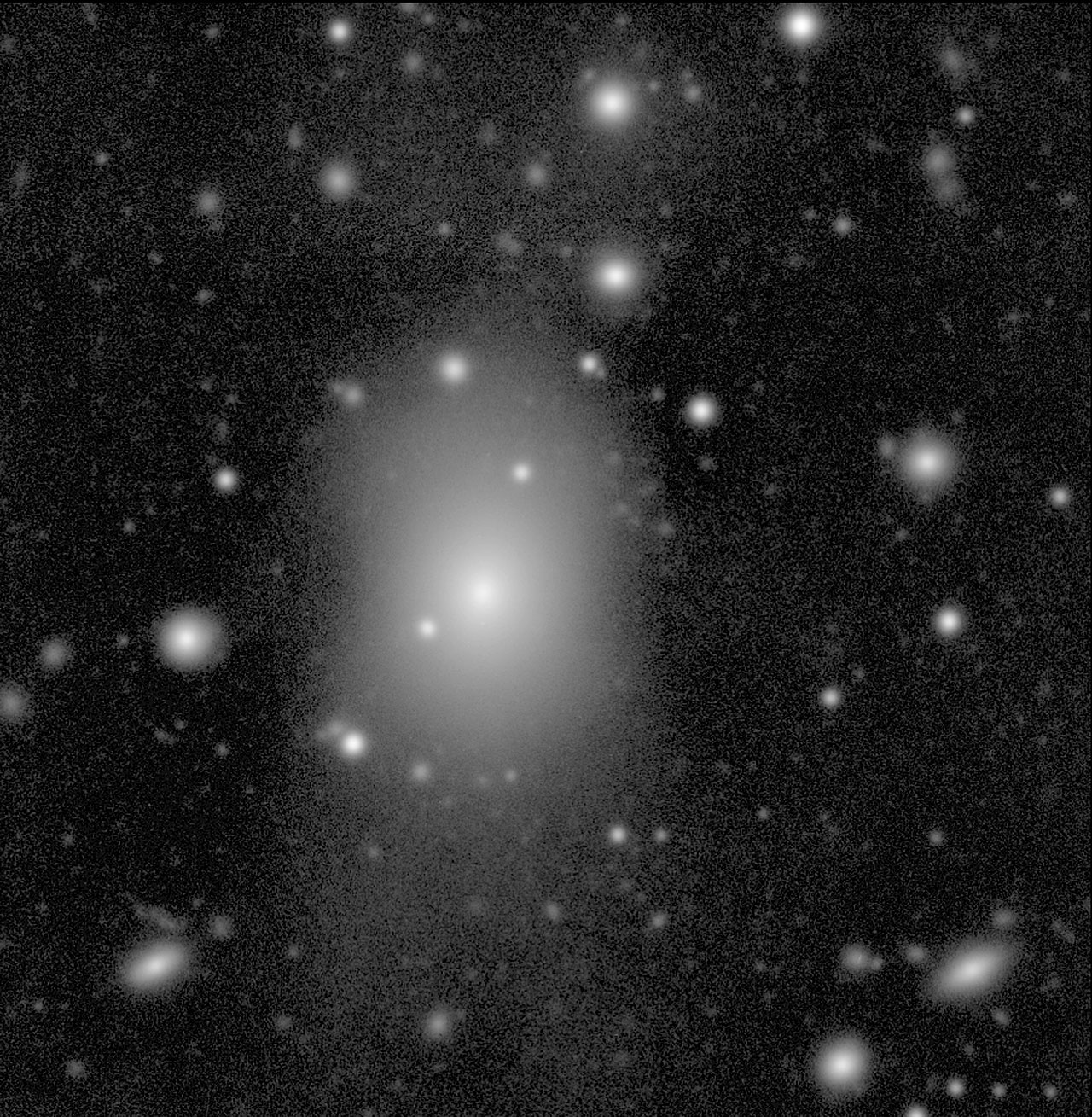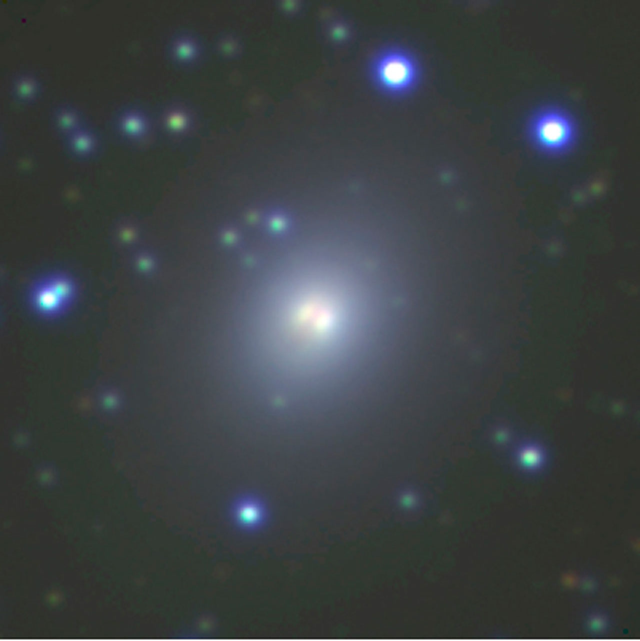 ESO Press Photo eso9954f shows the galaxy cluster Abell 496 [2], as observed with the WFI . It contains many hundreds of individual galaxies. The most prominent is a large and bright galaxy, close to the center. The mass of this galaxy is more than 10 12 times that of our Sun.