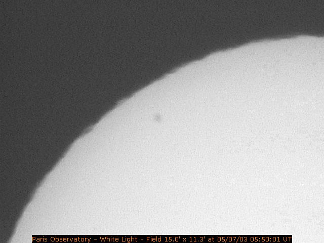 Mercury Transit on May 7, 2003 Central Display and Webcam... We are online with you during the entire event DO NOT FORGET THAT IT IS DANGEROUS TO OBSERVE THE SUN WITHOUT SPECIAL PROTECTION! The only completely safe way is to project an image of the sun on a white surface (for instance, a piece of paper or cardboard). Latest Information (May 7, 07:52 hrs CEST -- 05:52 hrs UT) The transit is now going on smoothly. Images are updated every minute on the webcam of ESO. Mercury can be seen as a small dot at around 1 o'clock. Observe also the sunspot at the bottom of the image. |  | Image in white light taken from the Observatoire de Paris with the Lunette Fluorite. The weather is also nice is Paris. | previous images... 1 2 3 4