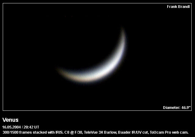 Frank Brandl 8-inch SC telescope; f/30; ToUCam Pro Baader IR/UV-cut filter; 300 images combined [Venus only 10.5° above horizon] May 16, 2004, 20:42 UT Steinheim, Germany |