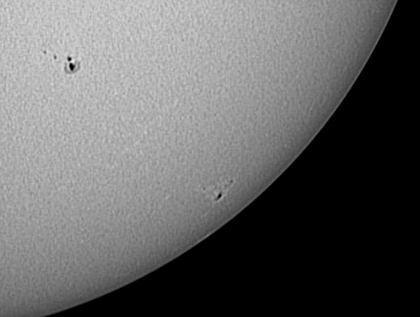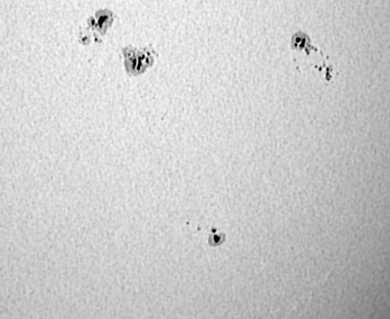 Paolo Casquinha 200mm Newton reflector; f/5 Philips ToUCam Baader solar filter and IRB filter May 16, 2004, 15:22 UT Qta do Anjo, Palmela, Portugal | Sunspots [600 x 453 pix - 47k]