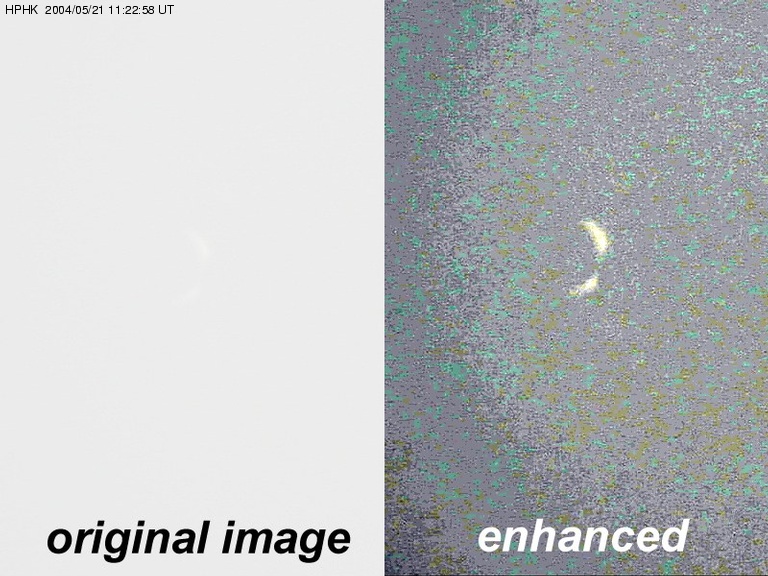 Herbert Raab [ Linzer Astronomische Gemeinschaft] 50cm Cassegrain telescope; f/10 Wratten 29 (deep red) filter Mintron 12V1C-EX B/W video camera 1 frame per 5 sec; 14 frames in all (70 sec) [Through hole in heavy clouds] May 21, 2004, 11:17:50 to 11:19:00 UT Linz, Austria |