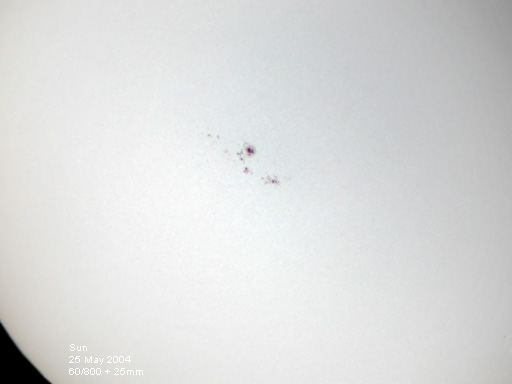 Ilyan Darganov and Borislav Petrov Nikon Coolpix 995 Solar filter Mylar May 25, 2004 Varna, Bulgaria More images at this site | Sunspots [512 x 384 pix - 21k]