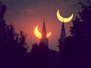 Zorko Vicar, Dejan Kolaric, Klemen Blokar, Peter Mihor and Matija Katelic [ Astronomical Group of Gymnasium Sentvid-Ljubljana] 10-inch Schmidt-Cassegrain - f/10 with 10mm eyepiece Canon A6- Digital Camera [Above the city of Ljubljana; Triglav Mountain to the left] May 24, 2004, 19:30 UT Ljubljana, Slovenia | The Eclipsed Sun and the Towers [4253 x 3190 pix - 380k]