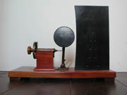 Robert Wielinga [This intriguing device was used during the VT-1874 expedition by a team of Dutch astronomers to the French Ile de Réunion. It was set up a few hundred meters from the telescope. There is a white background behind it and with the screw to the left the round disk may be moved back or to the black curve at the right. It was used to practise measuring the 2nd and 3rd contact. The black drop effect also shows up with this device and it helped the astronomers to find their own personal error in measuring the contact times. This device is now in the exhibition "Venus achterna" (chasing Venus) in Museum Observatory Sonnenborgh in Utrecht.] May 26, 2004 Utrecht, The Netherlands |