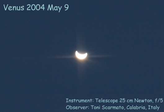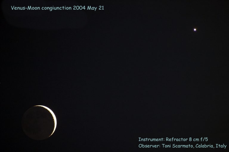 Toni Scarmato 25-cm f/5 Newton reflector Canon 10D; 100 ISO; 1 swec May 9, 2004 San Constantino di Briatico, Calabria, Italy | Venus and the Moon [768 x 512 pix - 62k]
