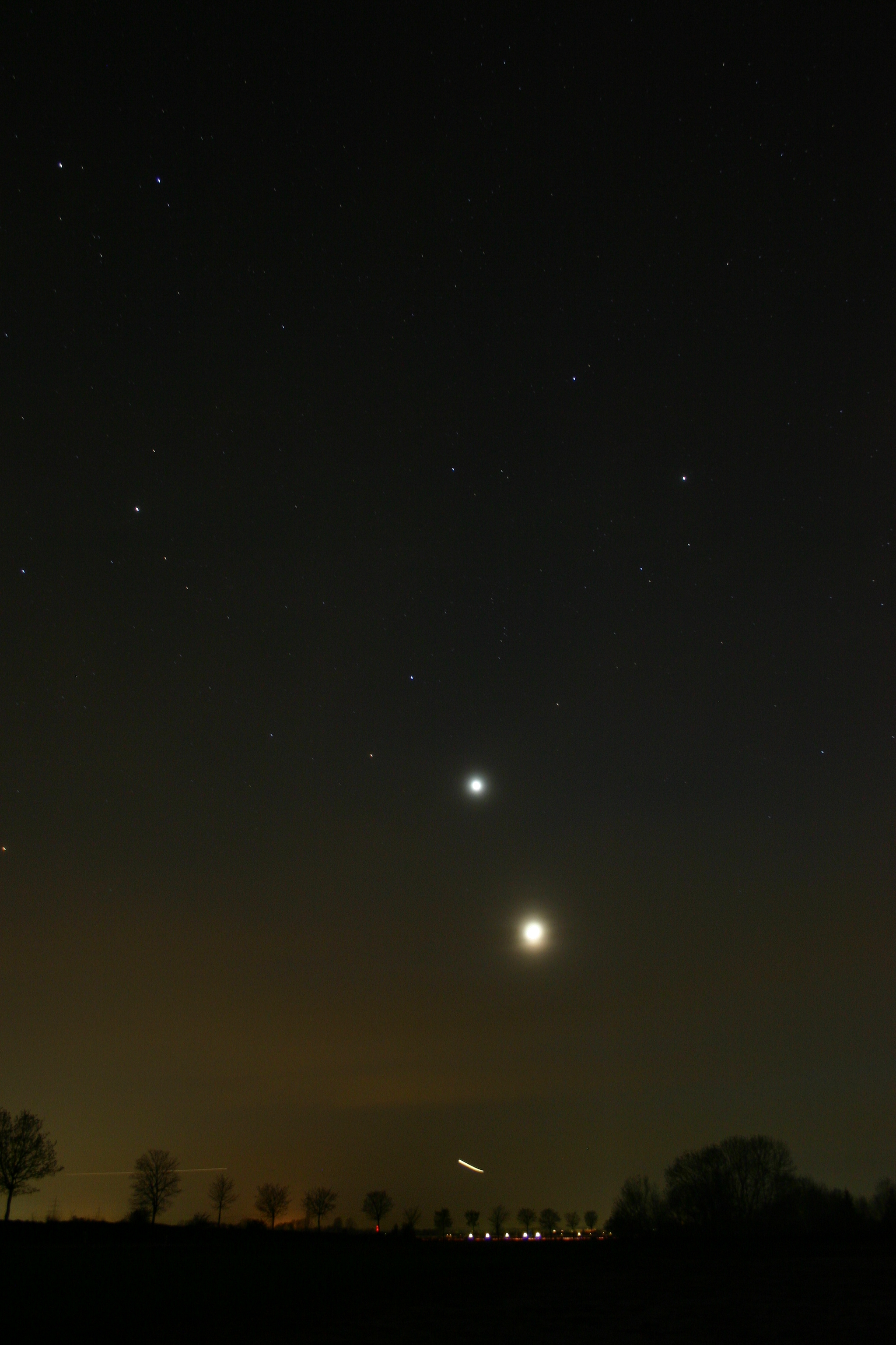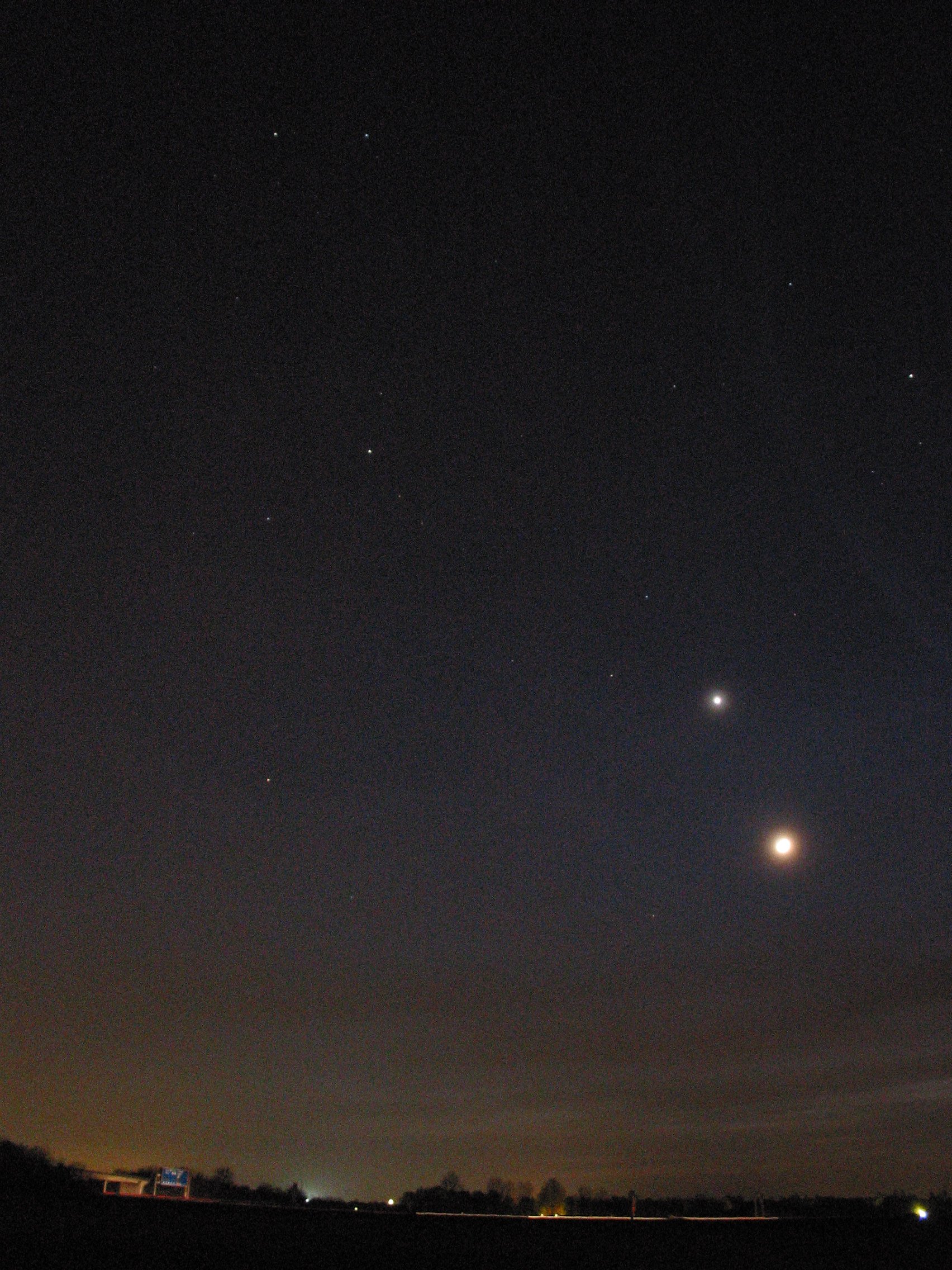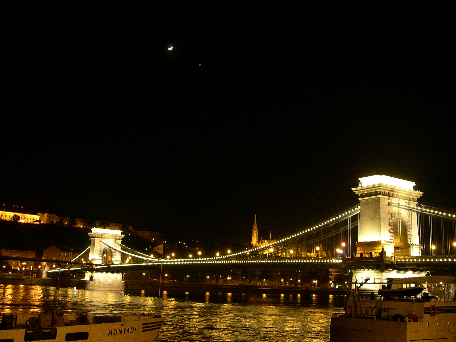 Attila Mizser Nikon Coolpix 4300 ISO 400; 1/4 sec; f/2.8 [Seen above the Chain Bridge; Mars is faintly visible to the left of the Moon] April 23, 2004, in the evening Budapest, Hungary | Venus and the Moon [1280 x 960 pix - 134k]
