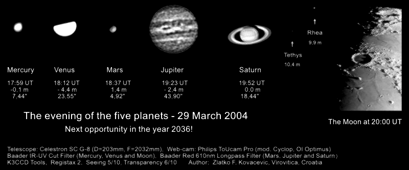 Zlatko Kovacevic Celeston SC G-8 with ToUCam Pro [Rare opportunity to photograph these objects at once] March 29, 2004, 17:59 - 20:00 UT Virovitica, Croatia More images at this site |
