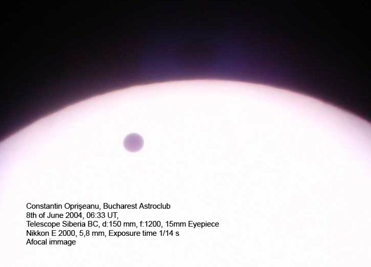 Constantin Opriseanu Bucharest Astroclub Telescope Siberia BC; d = 150mm; d = 1200mm Nikkon E 2000; exp.: 1/14 swec June 8, 2004, 06:33 Bucharest, Romania | Venus Near the Border [2272 x 1704 pix - 434k]