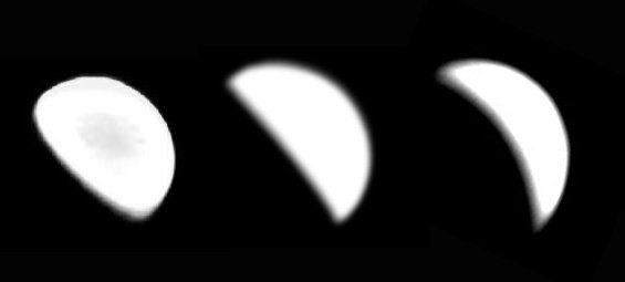 Mike Cripps Neatherd High School Astronomy Club Orion ED 80mm Apo-Refractor + Philips Webcam [Three images showing the phase change as Venus approaches us in its orbit] March 13, April 11 and 22, 2004 Dereham, United Kingdom More images at this site |