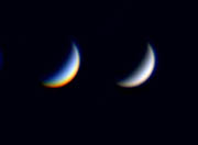 Vladimir Lozanov 11 x 70 Binoculars Canon Powershot A70 F/2.8 - f=5.4mm - 3x4 sec [Three-image composite] April 4, 2004, 20:09 UT Sofia, Bulgaria | Venus' Crescent [620 x 453 pix - 10k] [With text - 620 x 453 pix - 10k]