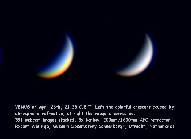 Robert Wielinga 200/1600mm refractor 351 webcam images stacked [Left: colours caused by atmospheric refraction; Right: corrected] April 26, 2004, 19:38 UT Utrecht, The Netherlands |