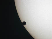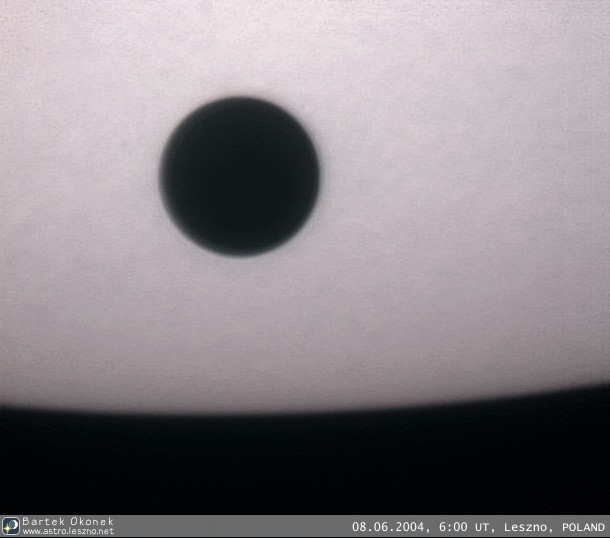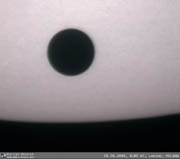 Emmanuel Vuylsteke 125mm f/6 refractor with 3x Barlow DSLR Nikon 70 and Solar Filter ND3 1/8000 sec; ISO 200 June 8, 2004, 05:39:47.7 UT Lasne, Belgium | Venus at 3rd Contact [320 x 213 pix - 18k]