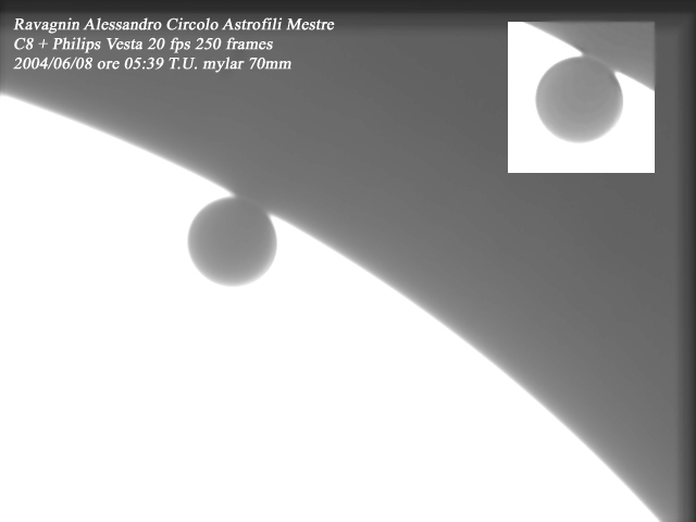 Alessandro Ravagnin Circolo Astrofili Mestre Celestron-8 Philips Vesta 20 fps Composite of 250 frames June 8, 2004, 05:39 UT Mestre, Italy | Venus Exiting the Solar Disc [640 x 480 pix - 70k]